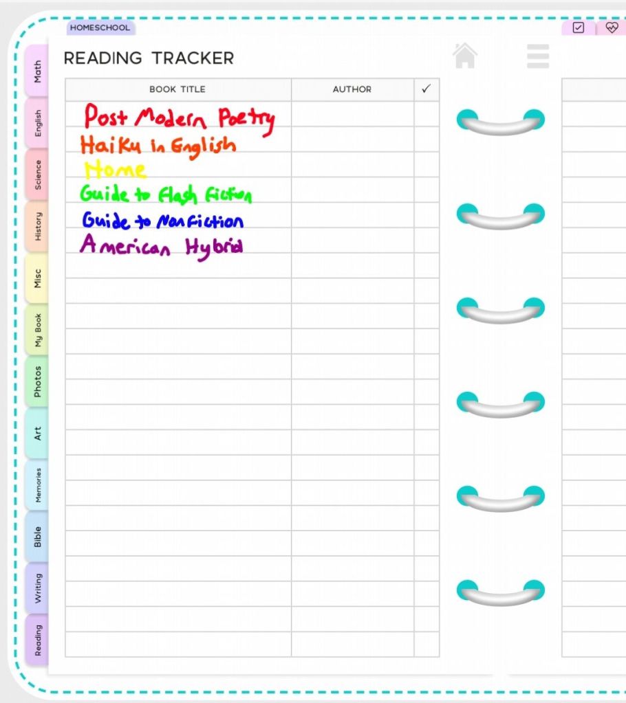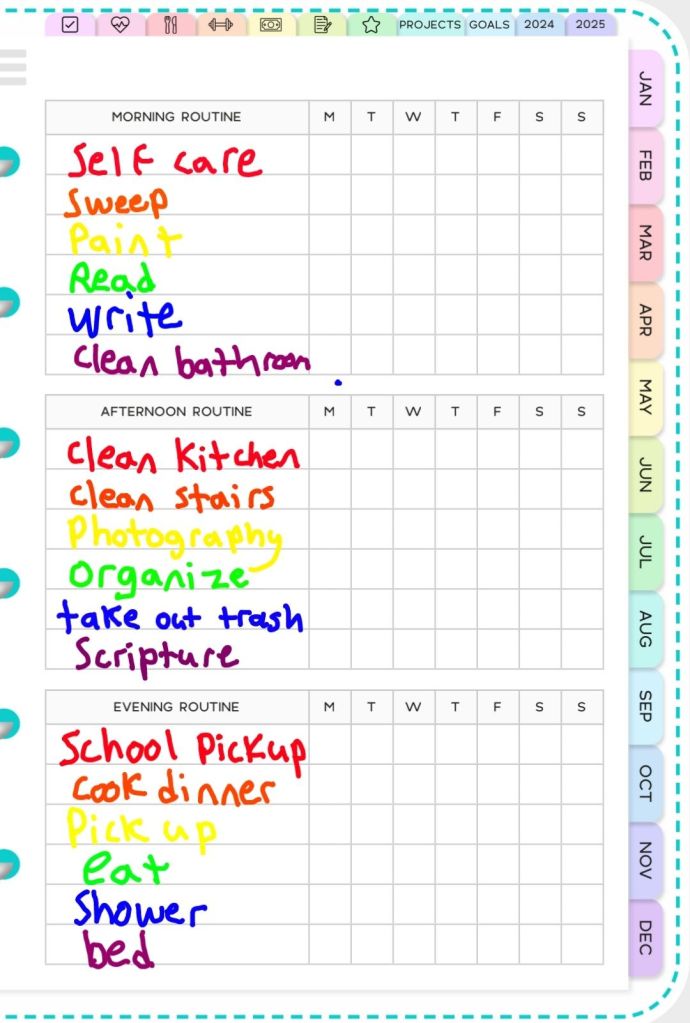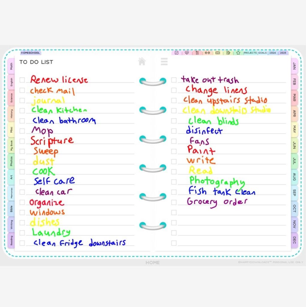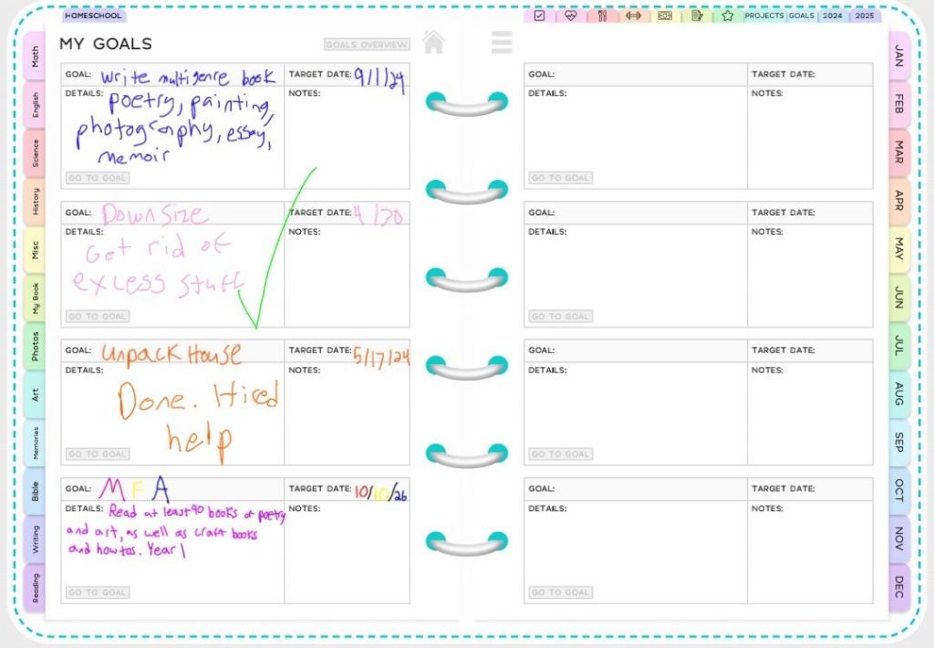 I have started using my digital planner again. It’s a homeschooling planner because when I bought it I thought we”d be homeschooling. Next year I might get a faith planner instead. Or I might keep this one for 2025 and use some of the homeschooling stuff for my self directed “MFA.”