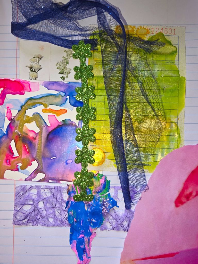 It’s a start. I’ve never done one of these before, but I find it relaxing. I use fabric, paper scraps, paint skins, photos, stickers, washi tape and more.